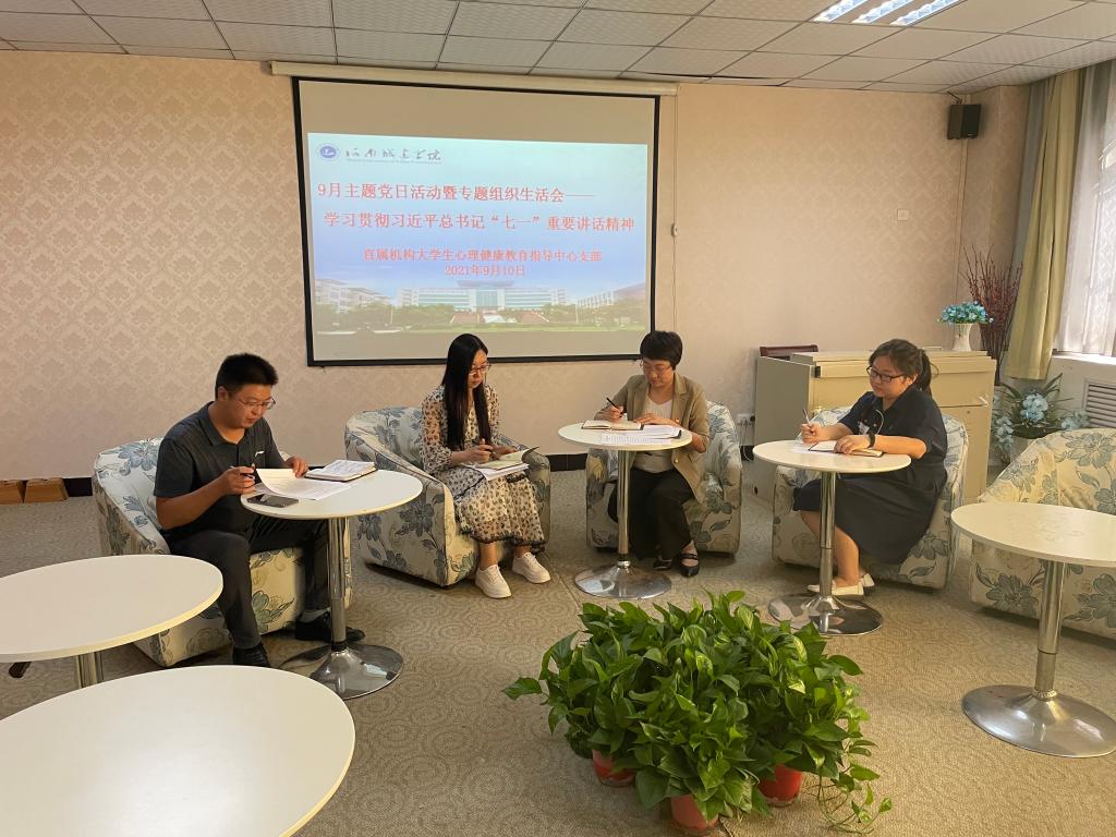 2021年9月10日,直属机构大学生心理健康教育指导中心支部以九月主题党日活动为载体开展“学习贯彻习近平总书记‘七一’重要讲话精神专题组织生活会。