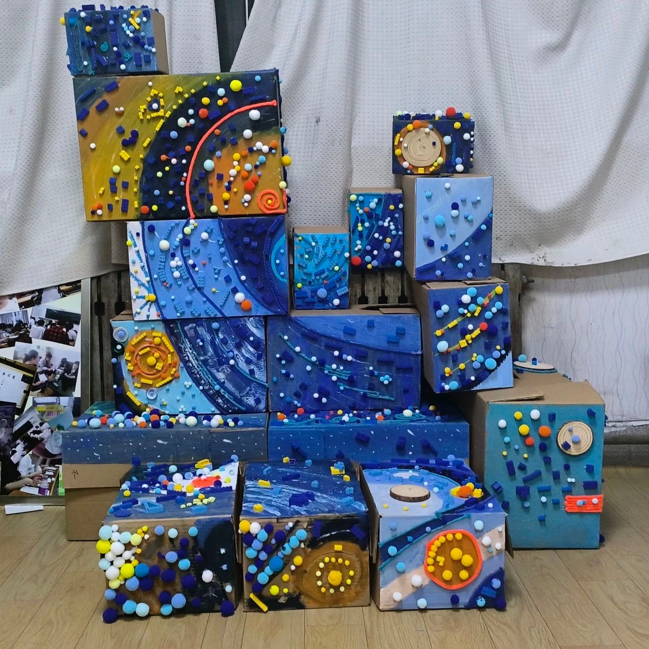 星河在下,波光在上。画笔勾勒,毛球、积木玩具、麻绳彩线点缀,好像捕捉到了一方银河。把星空的艺术高低错落地摆放,让心中构想变成现实。