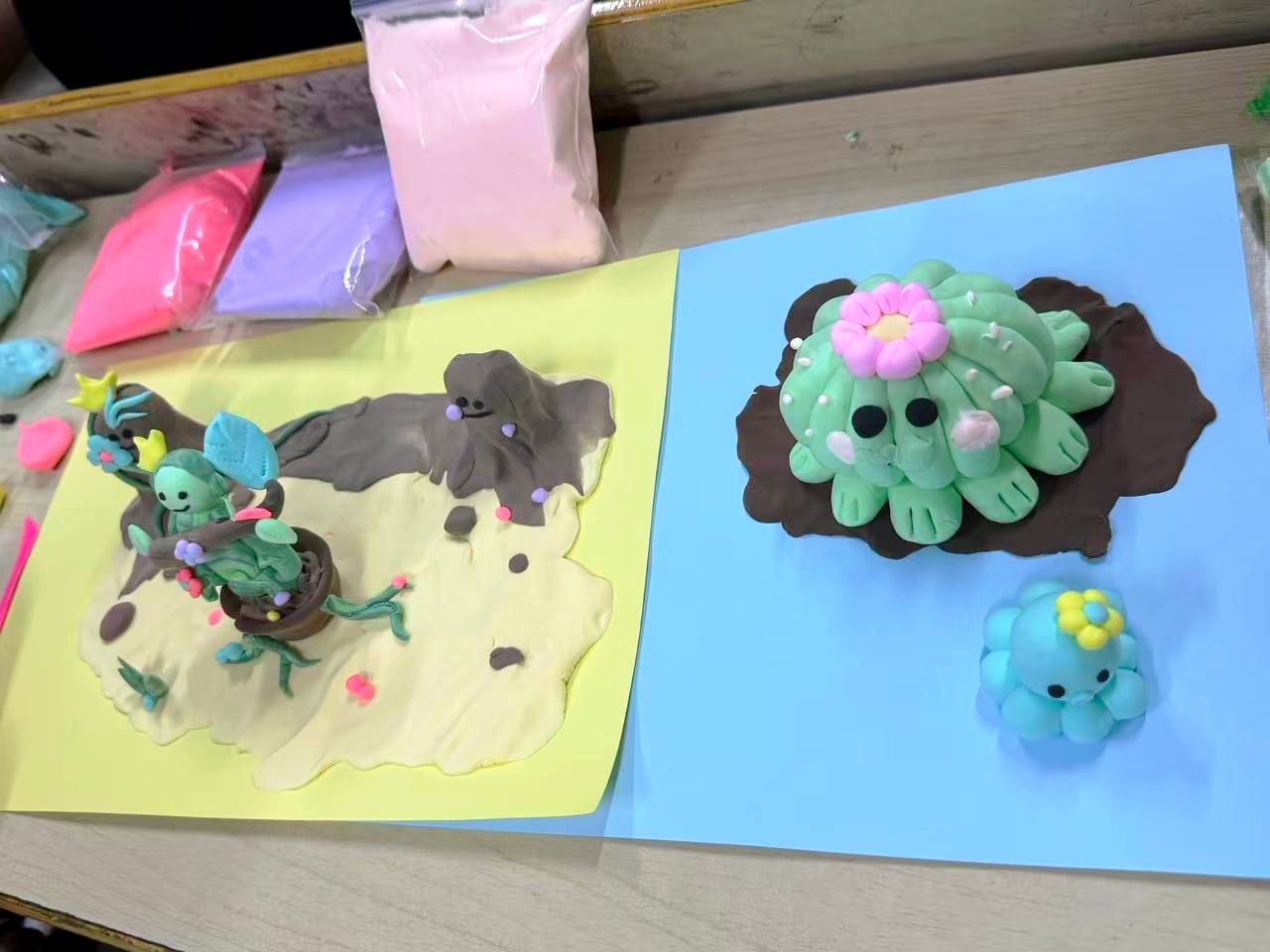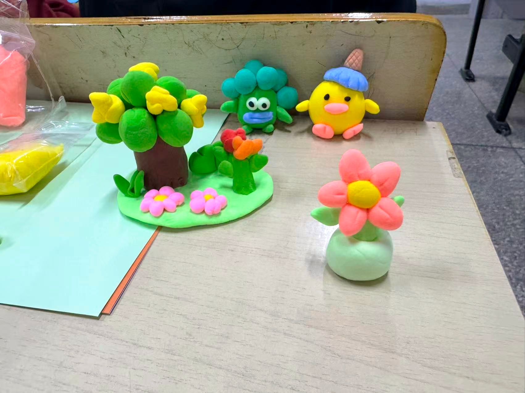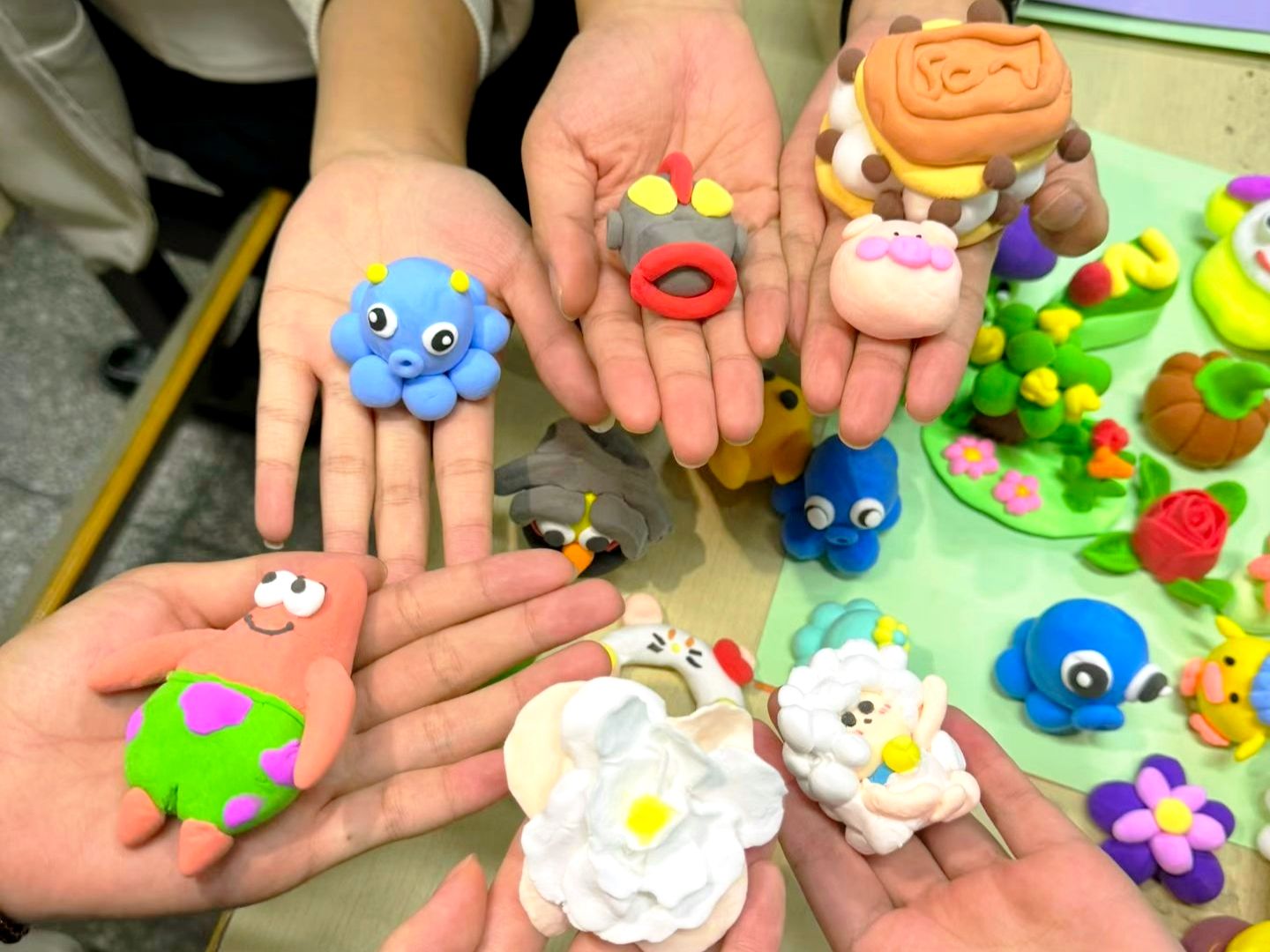 活动以“情绪疗愈+创意表达”为核心,设置“粘土植物、萌物创作”环节,同学们或单独挑战,或组队攻坚,以饱满的热情积极参与。活动中,同学们将内心情绪转化为造型各异的作品——既有拟人化的“笑脸仙人掌”、“治愈系小花丛”,也有充满童趣海绵宝宝、小企鹅等卡通形象,借由揉捏、塑形的过程释放负面情绪,以色彩与创意传递温暖共鸣。创作完成后,学生们展示作品并分享创作思路,将“坏情绪”以艺术方式“回收”,同时从他人的作品与分享中收获“暖鼓励”。