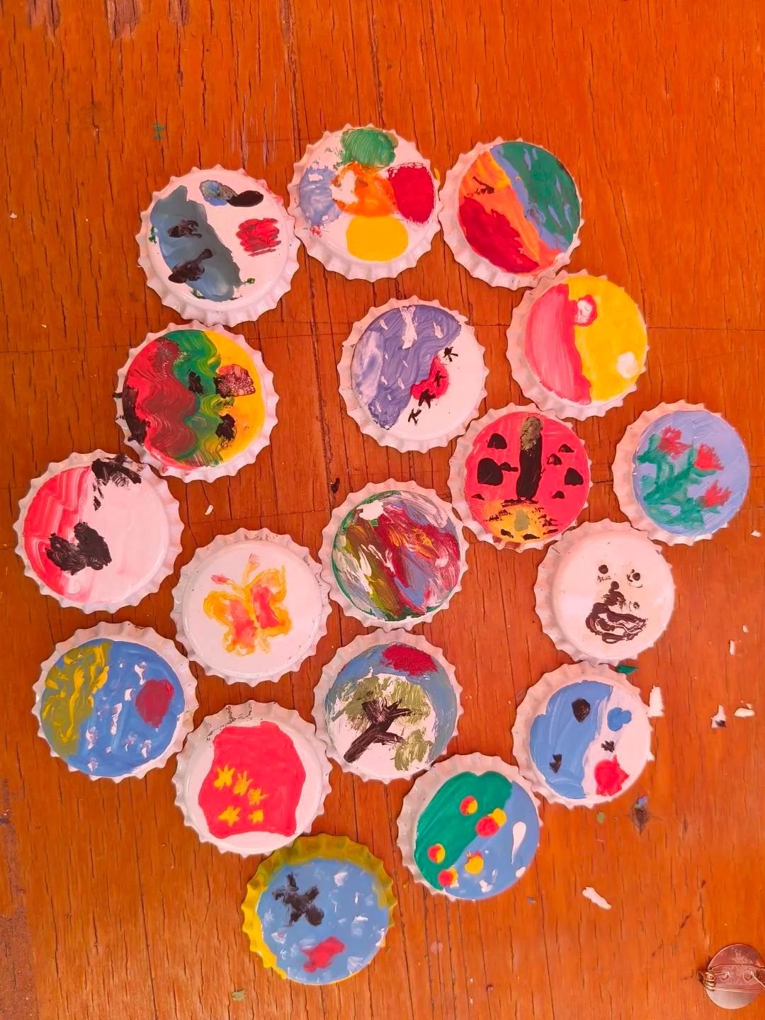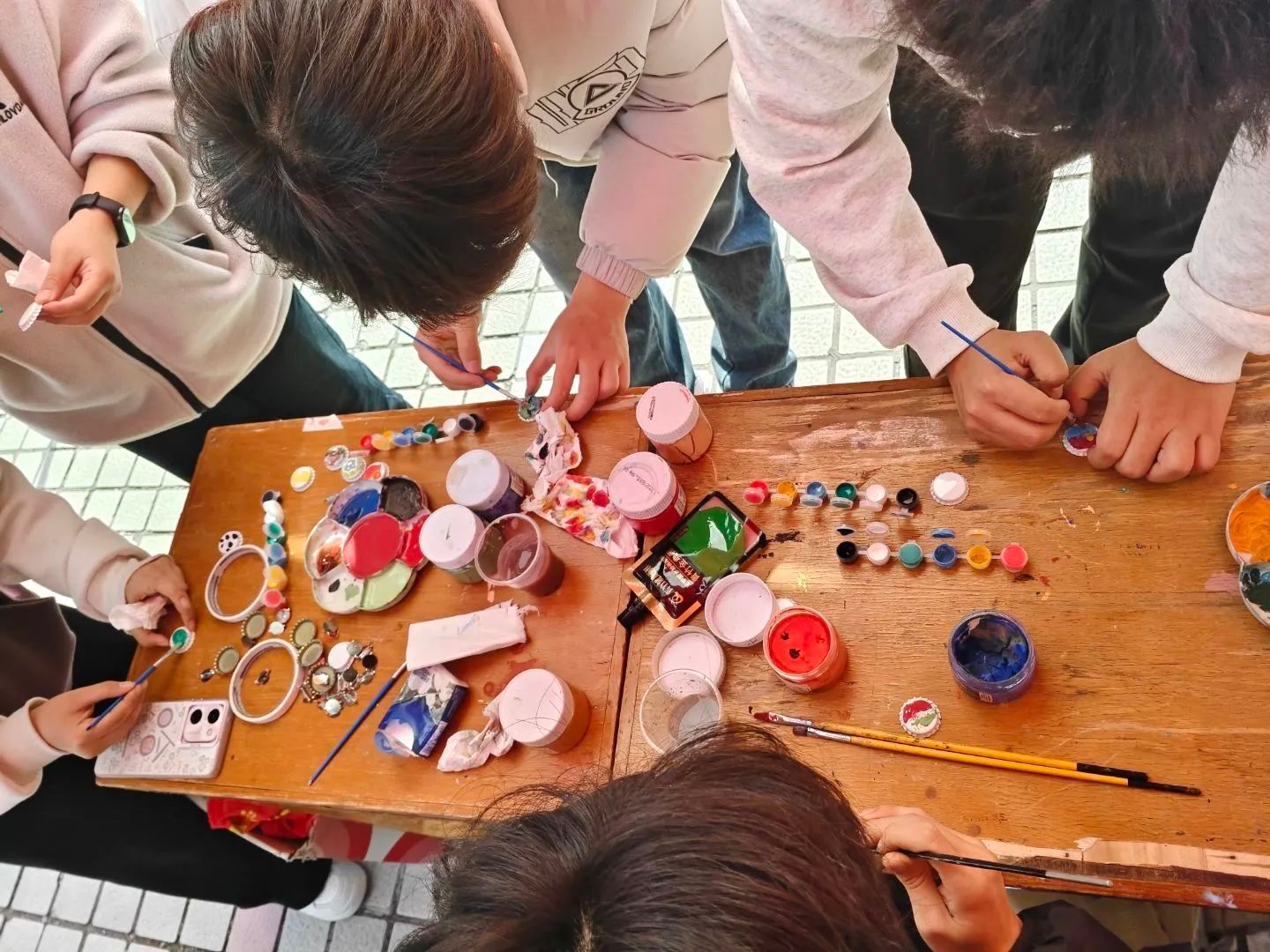 活动过程中,大家根据自己的创意,手执画笔,在小小瓶盖上画下彩色图案。学生用彩绘将压力、快乐等抽象情绪转化为瓶盖上的具象图案,如用蓝色波纹隐喻焦虑释放、暖色调花朵象征希望萌发。