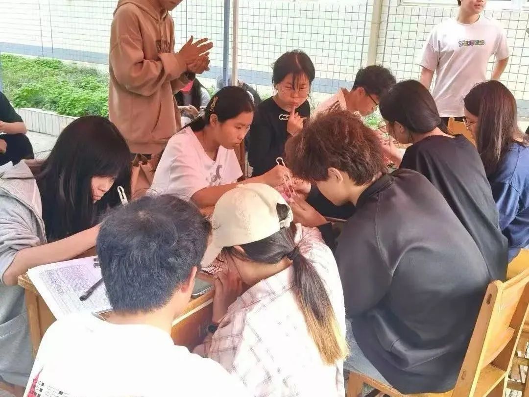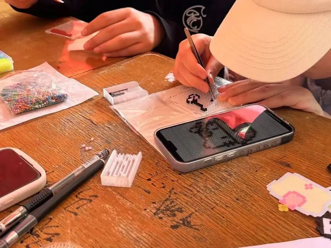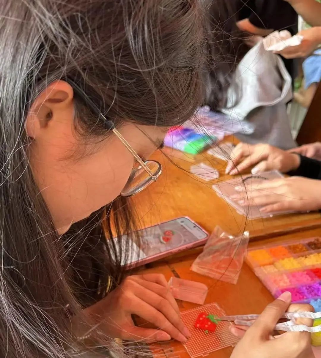 在创作过程中,同学们全神贯注、各显神通。有的同学绘制出精致的二次元人物,有的设计出简约的卡通图案,还有的以校园景色为蓝本,制作出承载校园记忆的作品。一颗颗小小的拼豆在同学们手中变成了一件件精美的手工艺品,每一件都凝聚着独特的创意与个人风格。