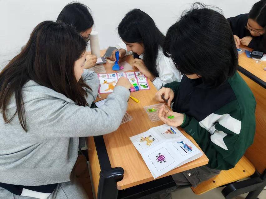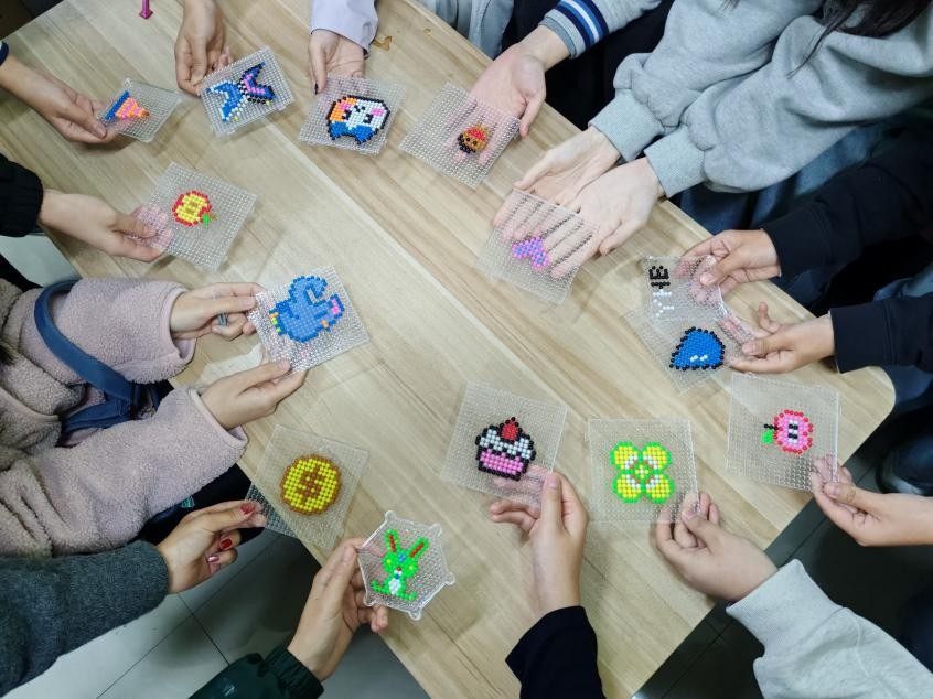 活动现场,五彩斑斓的魔珠、各式各样的模板和喷壶等材料早已准备就绪。在心理部成员的耐心指导下,大家纷纷投入创作,将一颗颗微小的彩色珠粒在模板上拼放出自己喜欢的图案,再用清水喷洒,待其自然风干后,一个坚固而精美的立体作品便宣告完成。随着一件件作品完成拼接固化,形态各异的创意成果铺满桌面:既有充满童趣的卡通形象,也有蕴含文化元素的纹样组合,展现出同学们丰富的想象力与细腻的内心世界,之后,同学们围绕作品分享设计理念,交流协作过程中的心得,笑声与讨论声交织,现场气氛温馨而热烈。