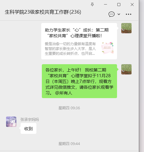 (通讯员阮小雪)为强化家校协同育人,共同促进学生心理健康成长,11月28日晚,生科学院组织学生家长在线收看了由河南城建学院大学生心理健康教育指导中心举办的“家校共育”第二期家长课堂。